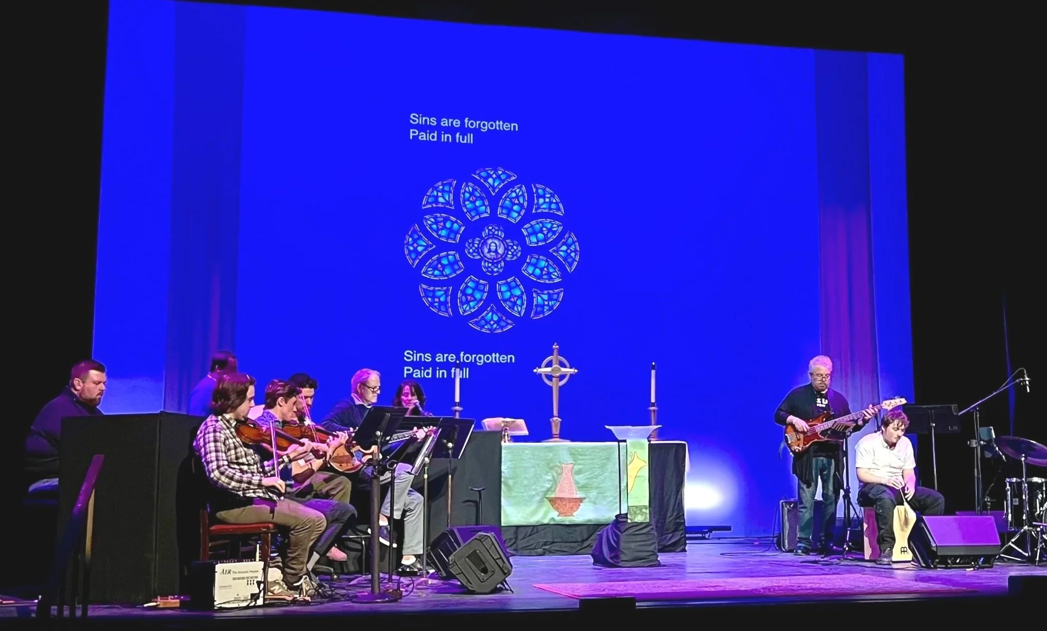 On a usual Sunday the chapel has TVs which display graphics and verses for the guests to read or sing along. We replicated that experience in Mendelssohn with a Panasonic 10K lumen projector and a long-throw lens to project onto the upstage cyclorama. Notably, the chapel has a large stained glass window above the altar, and we used a photograph of the window added as a transparent graphic layer in the projections to help the audience feel they were in their “home” church.